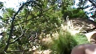 Sexy blonde with juicy tits gives head and gets fucked anal outside