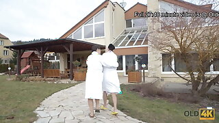 OLD4K. Chick tries swimming and being drilled by old boy in the pool